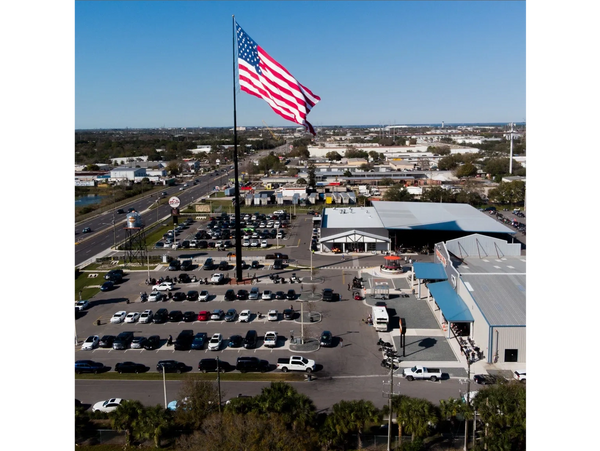 The flagpole is 200’ and is a part of Bert’s Tribute to America which includes a War Memorial with the history of H-D in war time circling a WWII WLA Model Harley-Davidson encased in glass. The flag itself is 50ft x 100ft and was installed in Dec. of 2021.